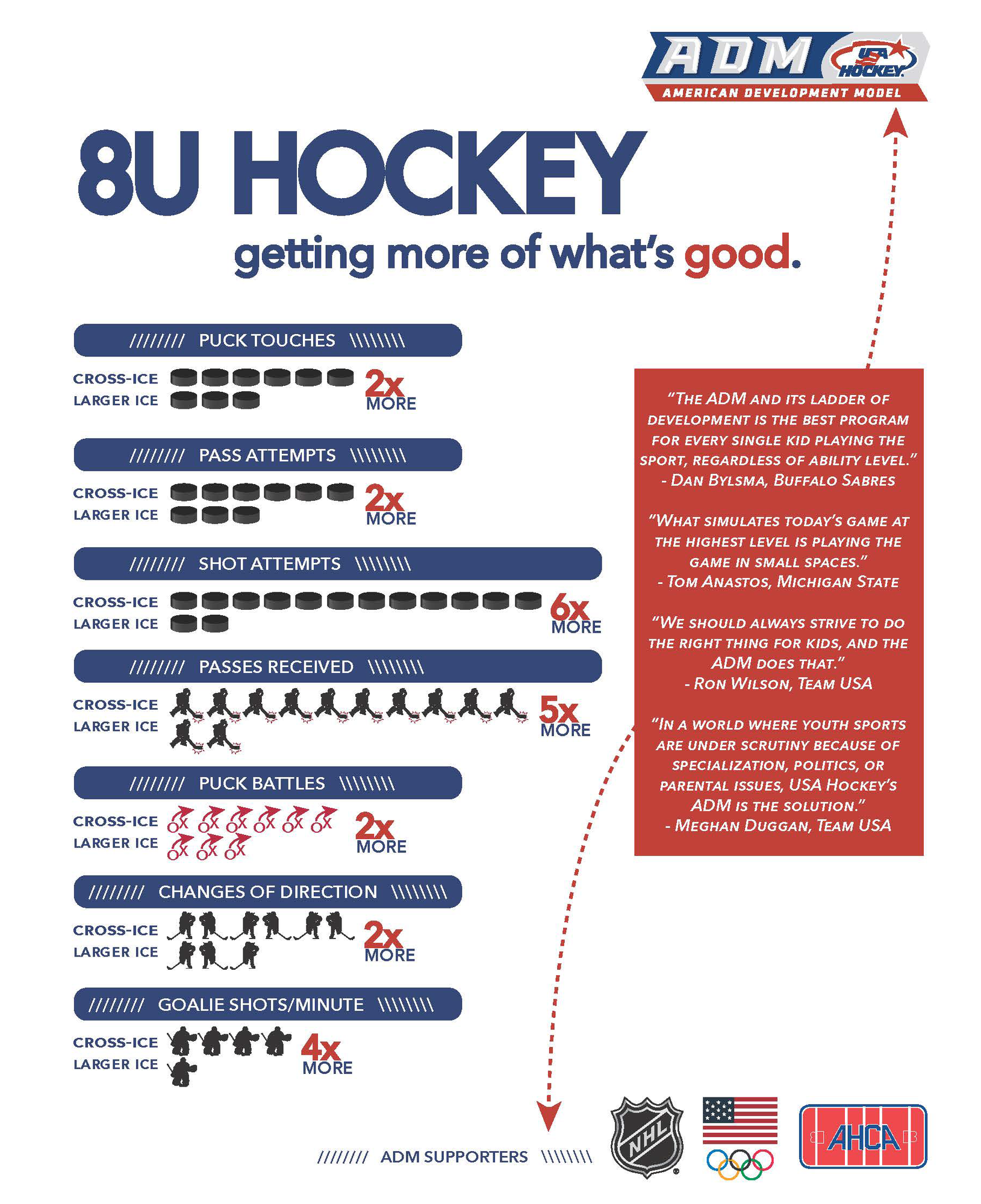 - Backed by Research: The ADM model is rooted in years of research that shows cross-ice play is the best way for young players to develop their skills. USA Hockey has seen proven results in skill development and player retention because the focus is on building a strong foundation of fundamentals early on, and cross-ice play is a key part of this approach.