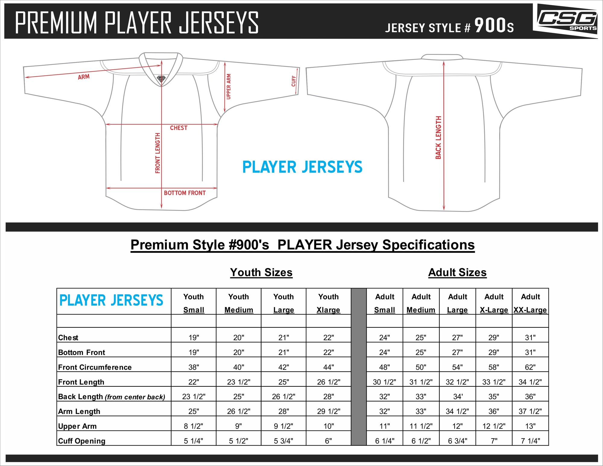 Our player jerseys are high quality, hand stitched, official game jerseys. Jerseys are available in either skater cut or goalie cut. Please see size charts below to ensure you order the correct size for your player.