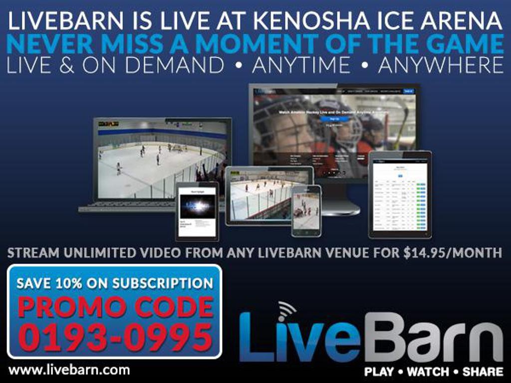 LiveBarn is available via a monthly subscription basis starting at $14.95/month. Use the Kenosha Ice Arena PROMO CODE: 0193-0995 for a 10% discount.