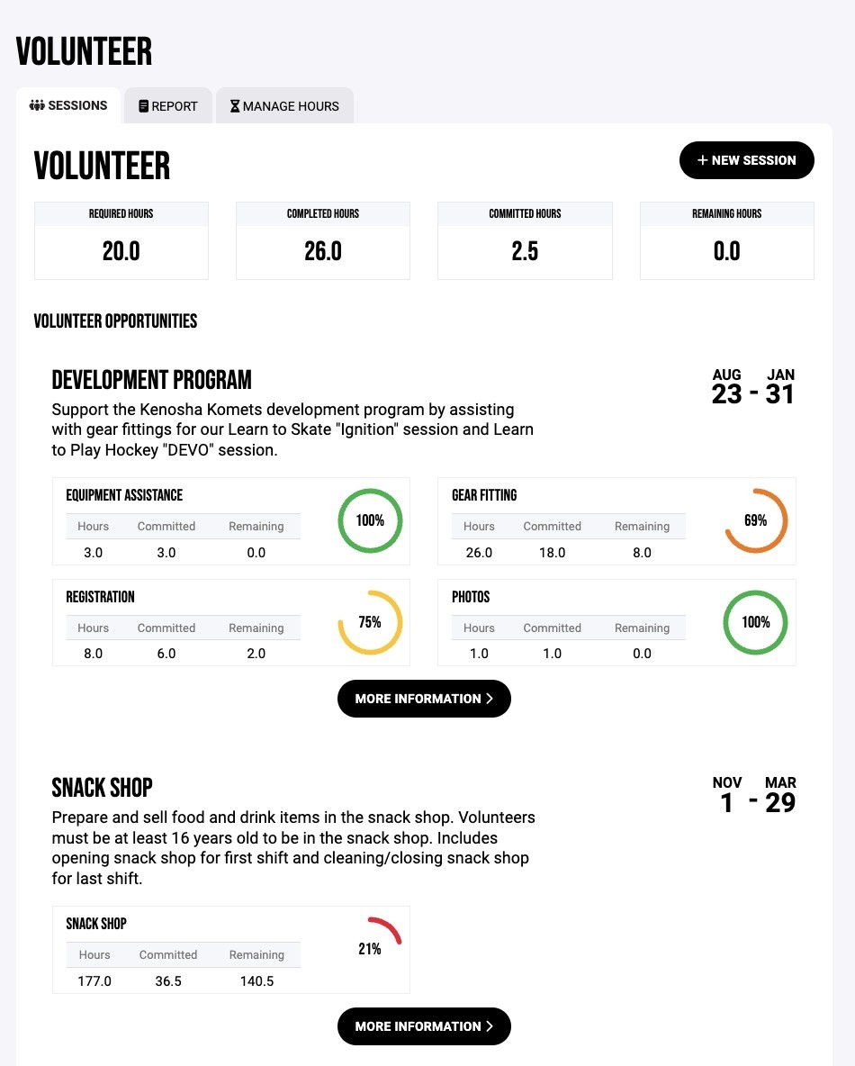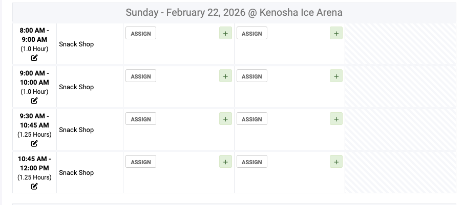 6) You will see a list of all open volunteer opportunities (for example SNACK SHOP, DEVELOPMENT PROGRAM, TRY HOCKY FOR FREE, K2 HOME TOURNAMENTS, and more!)